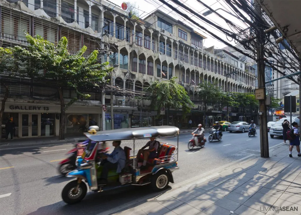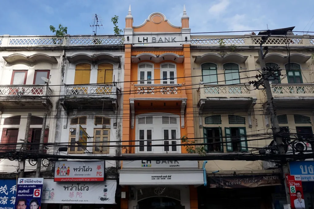 Bang Rak concentre une densité rare de bâtiments à façades néo-classiques, souvent signés par des architectes européens venus travailler pour la cour de Siam ou les compagnies étrangères. Anciennes banques, sièges de compagnies maritimes, résidences d’expatriés et bâtiments administratifs affichent corniches, frontons triangulaires, pilastres cannelés et balustrades. Longtemps considérés comme obsolètes face aux tours de verre, ces édifices bénéficient désormais de programmes de restauration sélectifs, parfois en partenariat public-privé.