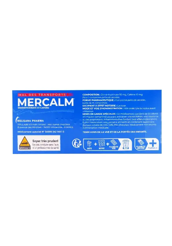 Chez l’adulte sain, le délai d’apparition des effets cliniques se situe entre 30 et 60 minutes, ce qui justifie la prise préventive avant tout trajet à risque. En situation réelle, on observe toutefois des variations liées à l’état digestif (repas copieux, prise d’alcool) et à la vitesse de vidange gastrique. C’est pourquoi, pour optimiser la prévention de la cinétose, il est recommandé de prendre Mercalm avec un verre d’eau, à distance d’un repas trop gras, afin de limiter les fluctuations de biodisponibilité.