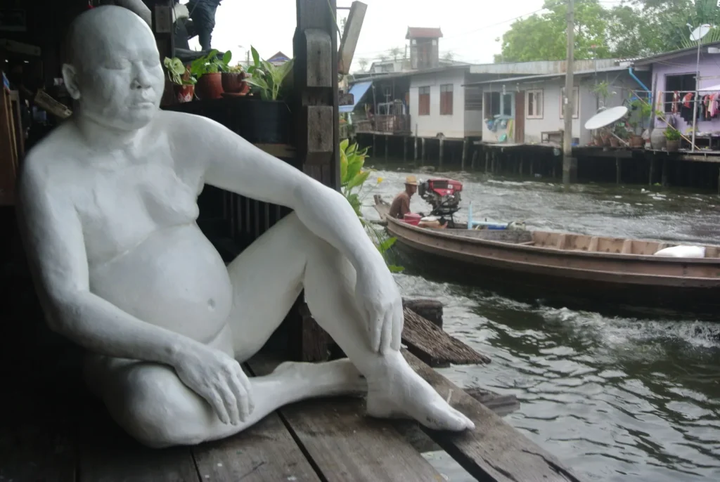Au cœur du khlong Bang Luang, Baan Silapin – littéralement « Maison des Artistes » – incarne à elle seule cette volonté de préserver un patrimoine fluvial tout en lui donnant une nouvelle fonction. Installée dans une maison en bois de plus de deux cents ans, cette structure culturelle accueille expositions, ateliers, petit café et, surtout, spectacles de marionnettes traditionnelles thaïlandaises. Dans la cour donnant directement sur le canal, des statues grandeur nature semblent contempler l’eau, tandis qu’à l’intérieur, masques, peintures et objets artisanaux créent une atmosphère à la fois ludique et contemplative.