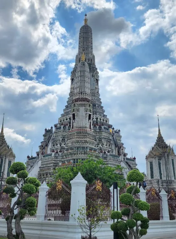 Symbole visuel de Thonburi et véritable icône de Bangkok, Wat Arun Ratchawararam se dresse sur la rive du Chao Phraya comme un phare minéral. Son prang central, inspiré des tours sanctuaires khmères, culmine à plus de 80 mètres et est entièrement recouvert de fragments de porcelaine et de céramique. De près, ces motifs floraux et géométriques révèlent une finesse d’exécution qui contraste avec la masse imposante de l’édifice. Au fil des décennies, plusieurs campagnes de restauration ont été menées, la plus récente s’étant achevée à la fin des années 2010, avec une attention particulière portée au remplacement des éléments de faïence abîmés.